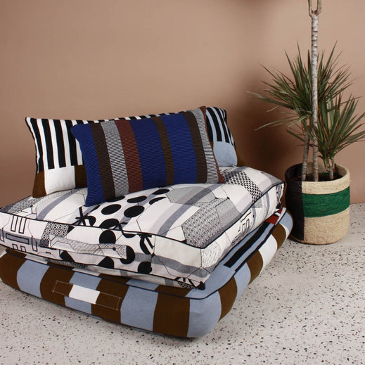 This Mapoesie Adonis cushion is brilliantly vibrant and gorgeously contemporary, featuring a play of khaki, brown and navy colours with woven stripes into a thickly textured cotto