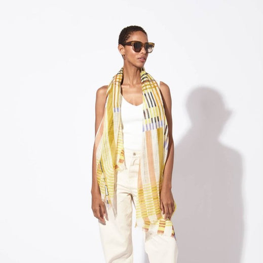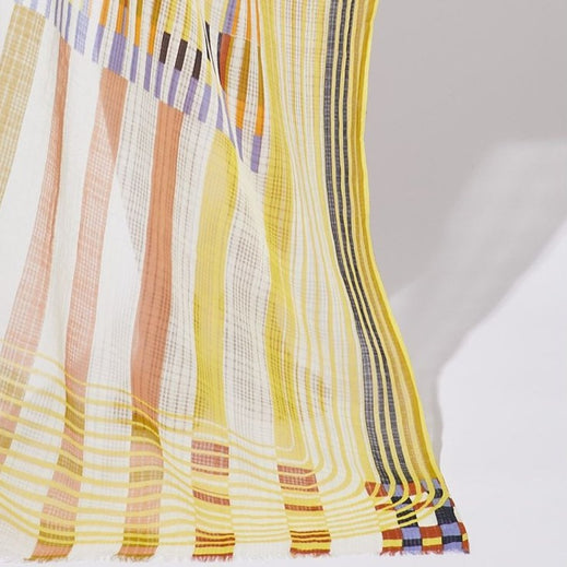 A rhythm and lines game are overlaid on this cotton and silk scarf.