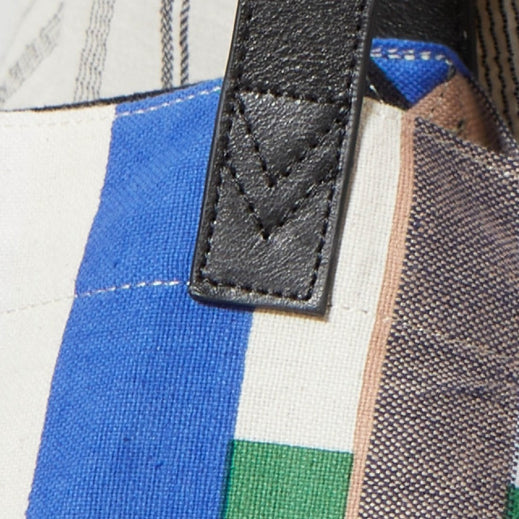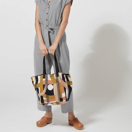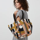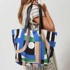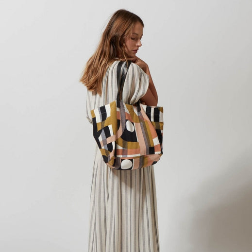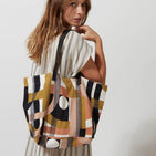 A whole array of geometric patterns, curves and lines brightens up this summer bag. The thick soft cotton handles guarantee durability and comfort.