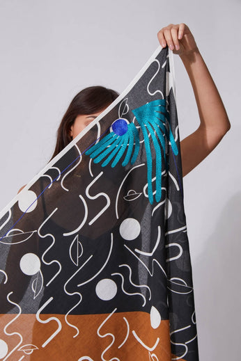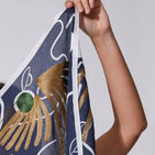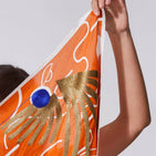 A large carré with combinations of colour that create a delightful duality where wild herbs are discretely drawn. The curved lines and shapes create an attractive design printed on a carré with hand embroidery delicately applied to the printed pattern.