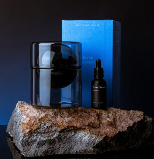 Escape to the water's edge with the evocative coastal fragrance of Studio Milligram's Ocean Odyssey Scent Chamber Volcanic Rock Set.