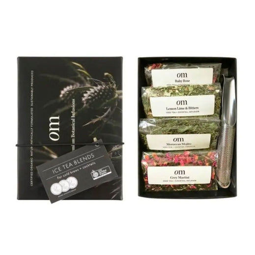 Celebrate summer with OM’s Organic Iced Tea Gift Set, featuring four award-winning loose leaf blends perfect for cold brews and refreshing cocktails. The set includes cocktail recipes and our popular stainless steel tea infuser. Perfect for hot summer days this is for the entertainer or foodie in your life.