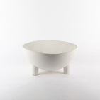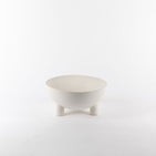 A sleek stoneware serving bowl finished in a soft matte white, supported by a set of three small feet. Available in two sizes.