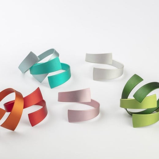 This jewellery range elegantly demonstrates Elaine and Viktor’s skill to make jewellery with clean sculptural simplicity, beautiful textures and an unforgettable pop of colour. Created from light-weight anodised aluminium, every piece compliments each other and sits well on the body making it fun and easy to wear.