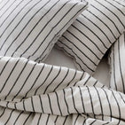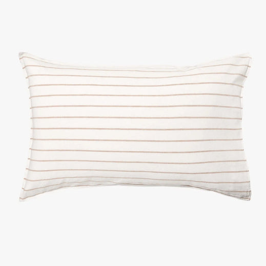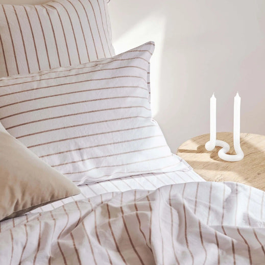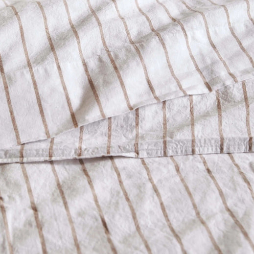 Loft features a spaced stripe woven in versatile Tan that runs across a soft off-white linen/cotton blend. Each Sheet Set is crafted from 55% French linen and 45% cotton, pre-washed for softness.