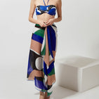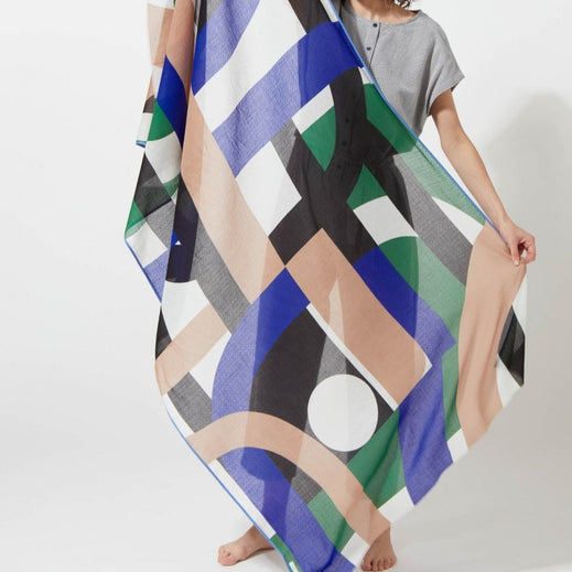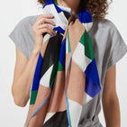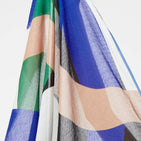A whole array of graphic patterns and bright colours. The play of curves and solid shapes brightens up any outfit. Raw edges finish with contrasting edges