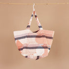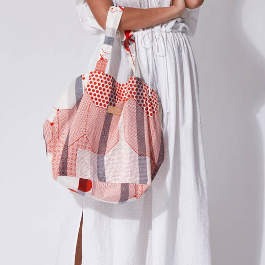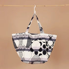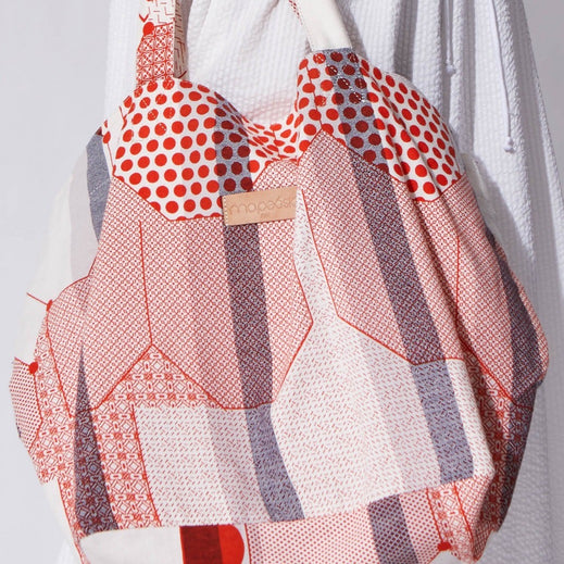 A variation of symmetrical patterns with a Mediterranean look can be seen on this soft cotton bag. The delicacy of the patterns is remarkable. This flat bottom bag can be carried by hand or on the shoulder, and can be taken to the beach, out shopping or away for the weekend.