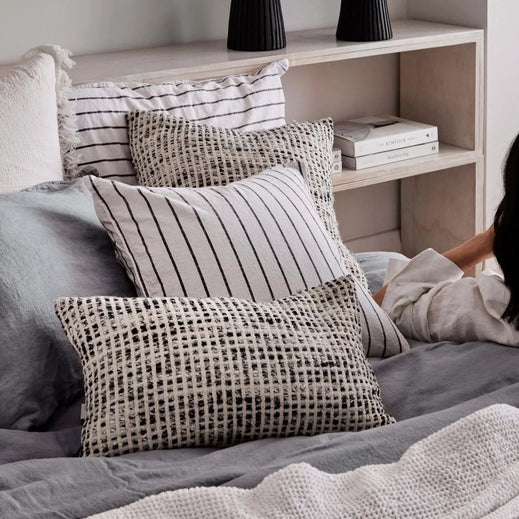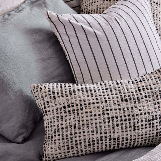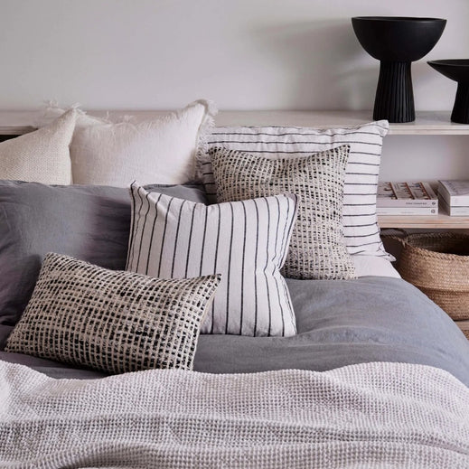 Hand loomed by skilled artisans, our intricately woven Nord cushions are the perfect addition to any interior space. Featuring a striped pattern in calming tones of pale azure, navy and black, woven throughout natural cotton, each thread has multi-coloured flecks running throughout to create a beautifully tactile design.
