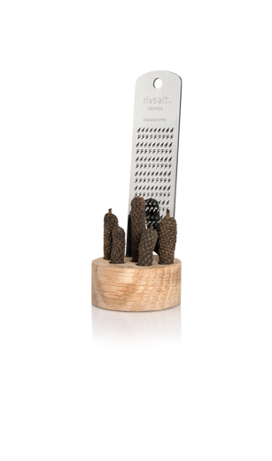 Rivsalt PEPPER is the perfect companion to our range of salts products. Each PEPPER-set contains several aromatic long peppers from the Indonesian island of Java. Together with the high-quality stainless steel grater and natural oak stand they truly become yet another conversation starter at the dining table.