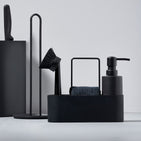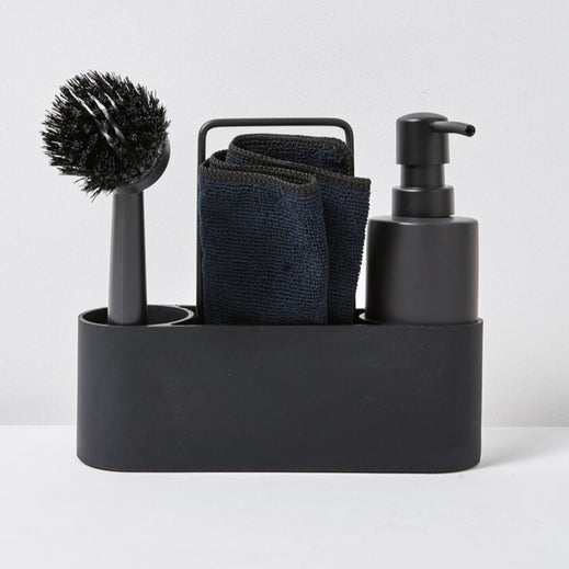 The dish washing organiser includes a silicone holder with room for a soap dispenser on one side and space for the brush on the other. The soap dispenser is made of ceramic, while the storage section is made in a scratch-proof and dishwasher-safe silicone.